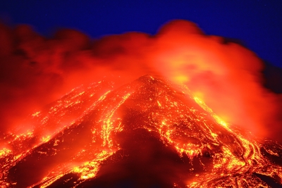 这是2月16日在意大利西西里岛拍摄的喷发中的埃特纳火山。欧洲最高活火山、位于意大利西西里岛的埃特纳火山近日再次喷发。 (新华社/美联)
