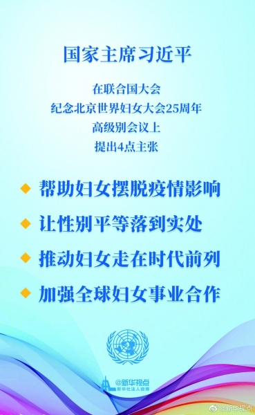 新闻回放:10月1日,国家主席习近平在联合国大会纪念北京世界妇女大会25周年高级别会议上通过视频发表重要讲话,提出帮助妇女摆脱疫情影响,让性别平等落到实处,推动妇女走在时代前列,加强全球妇女事业合作四点主张,并倡议在2025年再次召开全球妇女峰会。