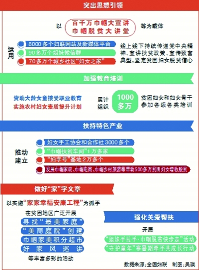 ——突出思想引领,以“百千万巾帼大宣讲”“巾帼脱贫大讲堂”等为载体,线上线下持续传递党中央精神、宣讲扶贫政策、宣传致富典型,坚定贫困妇女脱贫信心;