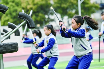 “嘿——呼——哈!”在成都市金牛区迎宾路小学的校园里,学生们手中紧握唐横刀模型,迈着整齐的步伐,正在体育教师曾科的指导下练习五行刀法套路。早在2011年,迎宾路小学就将武术项目作为特色体育课程引进校园。经过近十年的探索,目前学校已编撰成“成都赵门拳”教材,以“武术课+武术大课间+武术社团”的形式,施行选课走班的教学模式,让学校同一年级的学生在同一时间自行选择参与各个项目的体育课,形成了以强身健体,传承文化为目标的武术体育教学路径。