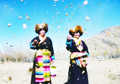3月16日,在位于西藏山南市乃东区门中岗村的“西藏第一块农田”上,当地村民在抛撒青稞种子。当日,位于雅鲁藏布江中游的西藏拉萨市、日喀则市、山南市等地农村启动春耕春播,播撒春天的第一粒种子。各地农村按着传统方式,穿着盛装,端着青稞酒,在田间地头举行开春仪式。    新华社记者 普布扎西/摄