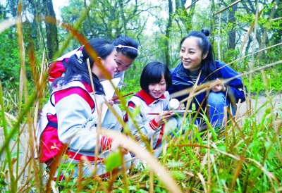 在九岭山国家级自然保护区,邹鸿堰(右一)给孩子们介绍森林里的植物。