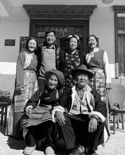 记事起,她就是个素面朝天并且很要强的小姑娘。我从未见过她打扮自己,也没见过她穿戴一金一银。一件粗糙纹路的毛衣和一条泛白的迷彩裤子,一双适合农村干活时穿的胶钉鞋,就是阿西玛一天甚至一周的穿搭。在我看来她一直都是朴实而又不失气质的农村妇女,蓬松的头发也被制服得服服帖帖,一根细长的辫子从肩头落到纤细的腰间,腰上系着传统彩色的崩典(藏族服饰中的一种)。
