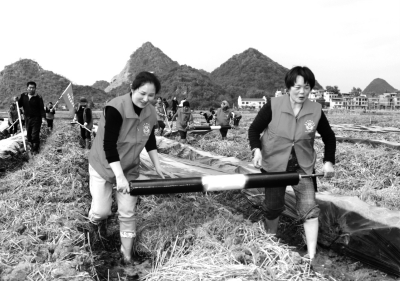 近日,在湖南省宁远县舜陵街道小康村田头,一群身穿红马甲的妇女帮助缺劳力种植户盖地膜。正值春耕农忙时节,宁远县妇联组织一支支由机关女党员、女干部、女职工和农村致富女能人、留守妇女等组成的巾帼助农志愿服务队,深入田间地头,帮助村民开展春耕生产。
