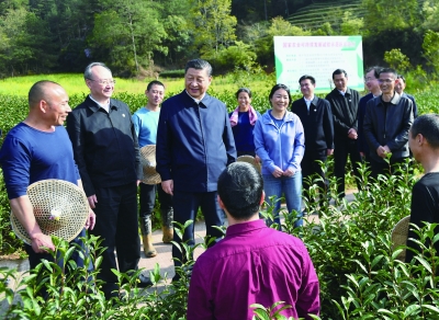 武夷山是乌龙茶、红茶的发源地。习近平来到星村镇燕子窠生态茶园,察看春茶长势,了解当地茶产业发展情况。习近平强调,要统筹做好茶文化、茶产业、茶科技这篇大文章,坚持绿色发展方向,强化品牌意识,优化营销流通环境,打牢乡村振兴的产业基础。要深入推进科技特派员制度,让广大科技特派员把论文写在田野大地上。