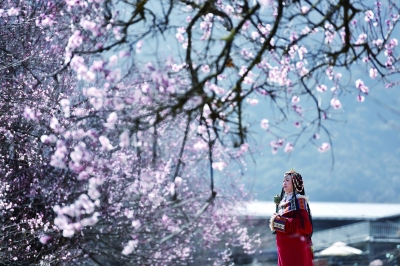 3月28日,一名游客在西藏林芝市索松村观赏桃花。 日前,西藏林芝第十九届桃花旅游文化节开幕。林芝意为“太阳的宝座”,平均海拔3100米,每逢初春,漫山遍野的桃花盛开,与蓝天白云、雪山冰川交相辉映。