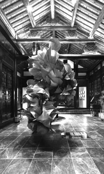 在成都邛崃一个百年老宅院的修复式改造中,曾稀在众多材料中,选用了和古建筑十分契合的蒲葵。经过处理的蒲葵颜色与古建筑色调相近,但是形状不够具有艺术性。于是,曾稀将几百张蒲葵的叶子手工再定型,一张张重叠,又一张张错落,做成大型的植物装置,吊在古建筑内部中心,让建筑和艺术完美融合。“而当有风吹来,或有人穿堂而过时,蒲葵叶便微微旋转,吸引了人的目光,形成自然、建筑和人之间互动的独特磁场。”曾稀讲述。