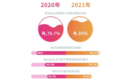 与2020年测评相比,当前平台青少年保护机制得到了进一步完善和落实:设有青少年保护模式的App占比从76.7%提升到85%。