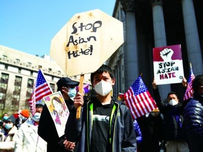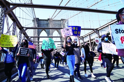 4月4日,人们在美国纽约参加游行反对亚裔仇恨。 当天,大量示威者在美国纽约举行主题为“停止仇恨犯罪、反对种族歧视、捍卫亚裔权益”的大型集会游行活动。新华社记者 王迎/摄