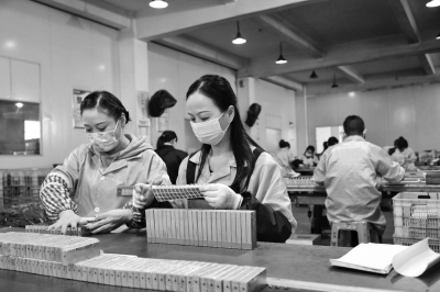 图为返乡妇女王梅(左一),在产业园企业工作。