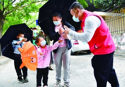 10时许,下起了小雨。“大家排好队,请保持一米间距。”李江蓉用沙哑的嗓音对前来采样的市民说。
