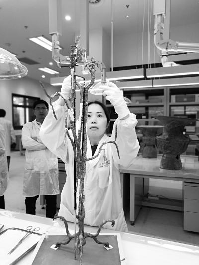修复文物不仅需要细心,还需要极大的毅力,每个环节都涉及多个工序,简单的修复,一般几天,稍微复杂的需要上月,像郭汉中老师对1号神树的修复则用了近10年。