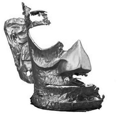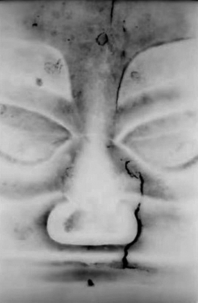 三星堆二号祭祀坑出土的一个三星堆面具,出土时完好,表面有锈蚀。我们尝试用X光照相机对面具的铸造工艺进行了分析。发现青铜面具的正面靠近头顶的部位和鼻子部位有裂隙,在眉毛里、鼻子左边的脸颊和左眼睛里有沙眼,嘴唇下方有孔洞,额头上有小的气孔,这些都是青铜器在铸造过程中形成的缺陷。而额头部位的气孔和疏松缺陷说明额头部位是浇铸口。这些信息不仅能为我们此后对该面具进行保护时提供针对性的方式,也有助于修复老师对其修复时进行保护。