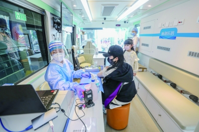4月7日,医护人员在移动疫苗接种车上进行接种准备工作。 当日,位于北京西单商业区的海乐苗移动疫苗接种车正式投入使用。在人流量较大的区域设立新冠疫苗接种点,有利于提高疫苗接种效率,还可为过往行人游客普及疫苗接种知识,加大宣传力度。从4月1日开始,北京丰台、西城、顺义、朝阳4个区先后启用海乐苗移动疫苗接种车,在社区、工厂、商圈等区域开展疫苗接种服务。 新华社记者 张玉薇/摄