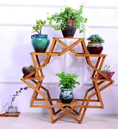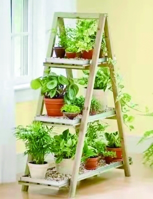 梯状花架。梯状花架下层可摆放体积较大的绿植,上层摆放体积稍小的盆栽,错落的花架能增加空间层次感。