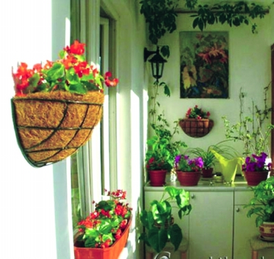 悬挂式花架。半封闭的阳台可以朝内挂上花箱、花篮等悬挂式花架,简单方便,适合种些喜光的中小型花。