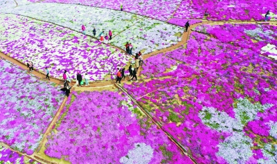 4月18日拍摄的迁西县大黑汀水库东岸的芝樱花(无人机照片)。 近日,河北省迁西县旧城乡北孙家峪村大黑汀水库东岸500多亩芝樱花竞相绽放,吸引众多游客前来赏花。