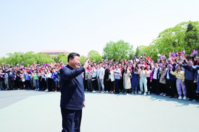 4月19日,在清华大学建校110周年校庆日即将来临之际,中共中央总书记、国家主席、中央军委主席习近平来到清华大学考察。这是习近平离开学校时,同师生们挥手致意。    新华社记者 鞠鹏/摄