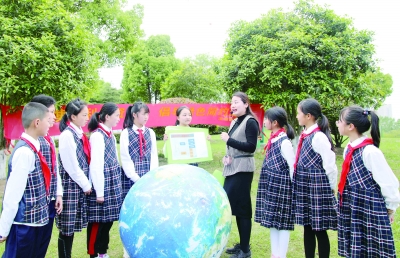 4月19日,老师在“森林小课堂”上给学生们讲述地球的板块构造。 当日,安徽省合肥市包河区滨湖城管办联合合肥市师范附属第二小学开展“保护地球 从我做起”主题活动。新华社记者 曹力/摄