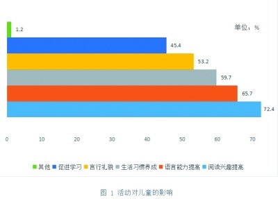 1.活动明显促进参与家庭儿童阅读行为的改变、阅读兴趣和语言能力的提高以及良好习惯的养成。参与活动与家长经常陪伴孩子阅读的行为显著相关,参与过活动的家长有89.3%能够经常性地陪伴孩子阅读,未参与过活动的家长只有63.5%能够经常性地陪伴孩子阅读。99%的参与家长认为活动给孩子带来了明显的变化,依次为:培养儿童阅读兴趣(72.4%),促进儿童语言能力提升(65.7%),帮助儿童养成良好生活习惯(59.7%),培养儿童文明礼貌行为(53.2%),帮助孩子更好地学习(45.4%)等(图1)。