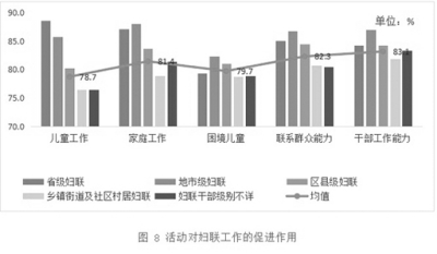 5.活动有利于基层妇联组织发挥职能优势。96.7%的被调查妇联工作者认为妇联组织开展亲子阅读活动有其自身优势,94.4%的妇联工作者认为当前工作发挥了妇联组织的优势。基层妇联工作者认为活动对本地妇联工作有很好的促进作用,认为活动对妇联干部工作能力的促进作用最大,为83.1分,认为活动对妇联工作促进作用最大的是地市级妇联组织,均值为85.6分(图8)。