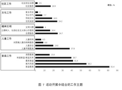 4.活动成为基层妇联整合工作的平台。活动表现出很好的主题兼容性和扩展力,与家庭教育、家庭建设、儿童保护、社会组织发展等多项工作相结合,成为基层妇联工作的有效抓手(图7)。一些地方妇联组织借助活动的互动性、阅读指导服务的贴近性,将活动用于推进扶贫攻坚、移民异地安置融合、禁毒宣传、党员干部廉政家风建设等当地党和政府的中心工作,取得良好效果。