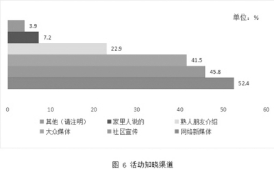 2.活动扩大了妇联组织影响力。43.8%的被调查家庭听说过妇联组织的“书香飘万家·全国家庭亲子阅读活动”,媒体尤其是新媒体和社区宣传是主渠道,人际传播作用明显(图6),表明活动已在家长群体中形成良好口碑,具备一定影响力,参与家庭会主动宣传,向他人推荐活动。知晓家庭活动参与率达25%,亲子阅读体验活动(51.4%)、收看网络讲座或课程(50.7%)、网络打卡等在线参与(41.3%)和现场专家讲座(39.7%)等形式最受家长青睐。