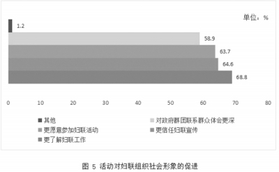 6.活动使家长群体更加了解和信任妇联组织。98.8%的参与家庭表示通过参加活动刷新了对妇联组织形象和工作作风的认知,家长更了解妇联组织的工作作风(68.8%),更信任妇联组织的宣传内容(64.6%),更愿参加妇联组织的活动(63.7%),对群团组织联系、服务群众的认识和体会更深(58.9%)(图5)。