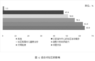 4.活动明显促进改善社区邻里关系、增强了社区凝聚力。97.6%的参与家庭认为活动明显改善了社区邻里关系,推进了精神文明建设,增强了社区凝聚力,依次是:改善社区邻里关系(63.9%),提高社区精神文明程度(62.4%),增强社区凝聚力和动员能力(56.1%),形成儿童友好的社区氛围(50.9%),以家庭为中心的社区活动增加(47.4%)等(图4)。