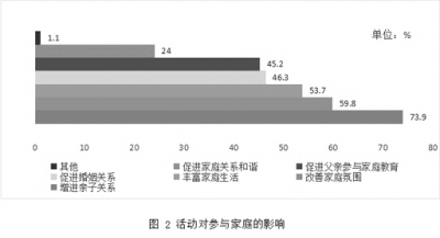 2.活动明显促进参与家庭成员关系的改善和家庭生活的和谐。99.1%的参与家长认为活动给家庭带来了明显的影响。依次为:增进亲子关系(73.9%),改善家庭氛围(59.8%),丰富家庭文化生活(53.7%),增进夫妻之间的沟通、促进婚姻关系和谐(46.3%),促进父亲参与家庭教育(45.2%),促进其他家庭成员之间关系改善(24%)等(图2)。