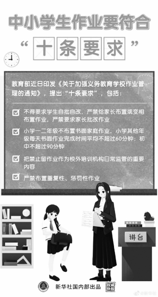 《通知》共提出十条要求,其中明确提出,不得要求学生自批自改,严禁给家长布置或变相布置作业,严禁要求家长批改作业,让作业回归到学校育人环节中来。