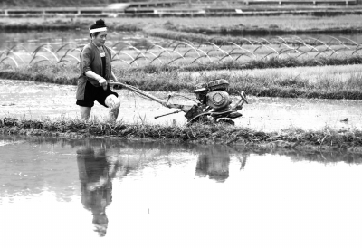 4月24日,广西三江侗族自治县良口乡和里村一名妇女驾驭小农机耕田。
