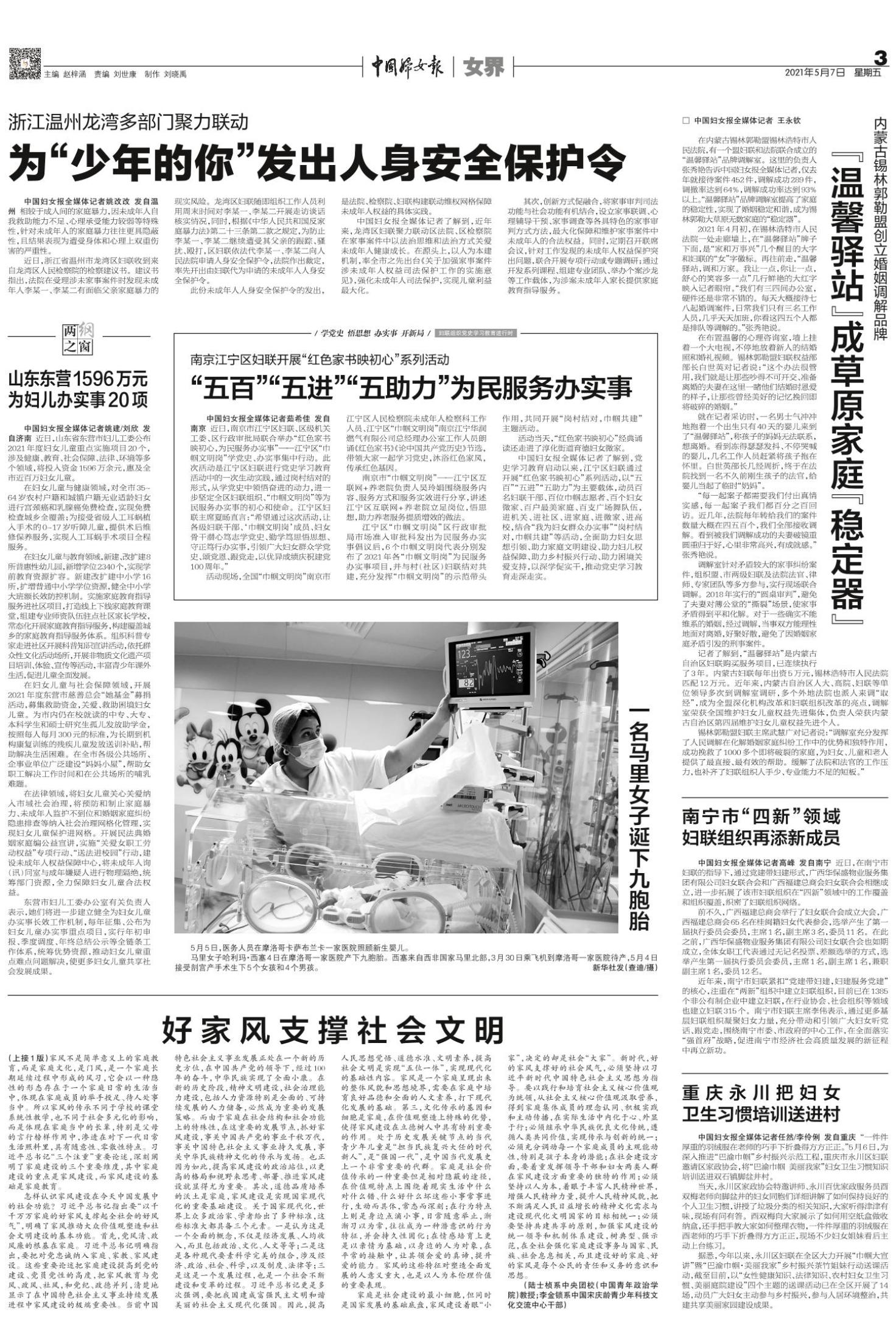 中国妇女报全媒体记者姚建/刘欣 发自济南 近日,山东省东营市妇儿工委公布2021年度妇女儿童重点实施项目20个,涉及健康、教育、社会保障、法律、环境等多个领域,将投入资金1596万余元,惠及全市近百万妇女儿童。