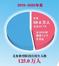 2019-2020年度,北京全市有46.1万名非本市户籍学生在北京范围内学校就读。其中,幼儿园11.4万人,小学25.8万人,初中6.3万人,高中1.1万人,流动人口中适龄儿童接受教育的权利得到保障。义务教育阶段在校生人数为125.0万人,其中女生59.6万人,占比47.7%,比2015年提高1.2个百分点。