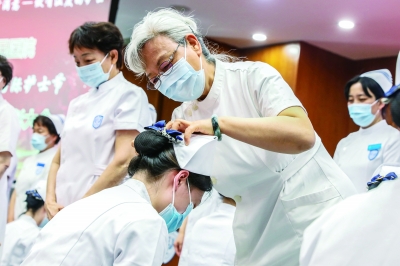 5月10日,北京大学人民医院的护理届前辈闫凤玲(中)为新入职护士授帽。当日,北京大学人民医院和中日友好医院举办护士节庆祝和表彰活动,迎接5月12日第110个国际护士节。    新华社记者 张玉薇/摄