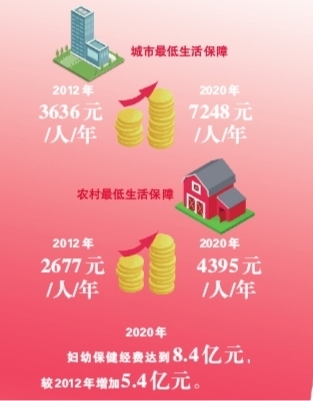 妇女儿童社会保障和福利水平持续提高。2020年,城市最低生活保障和农村最低生活保障分别达到7248元/人/年和4395元/人/年,分别比2012年增加3636元/人/年和2677元/人/年;城镇职工和居民基本医疗保险、城乡居民社会养老保险、失业保险和工伤保险妇女参保率也逐步提高;贫困和大病妇女儿童均享受到医疗救助。2015年起,未成年人救助保护机构新增37个,市(地)和县(市)基本实现全覆盖。