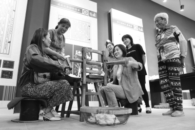 5月20日,在河北省威县常屯乡王目村土布纺织展览馆,陈爱国(左二)指导游客轧花。    威县土布纺织技艺是国家级非物质文化遗产,河北省邢台市威县常屯乡王目村的陈爱国是这项技艺的国家级传承人。近年来,陈爱国和丈夫高庆海收集了大量老纺织品以及杼、综、梭子、绕线墩、绕子、线拐子等工具,把自家老宅改造成了土布纺织展览馆,让更多人了解威县土布纺织技艺。    新华社记者 骆学峰/摄