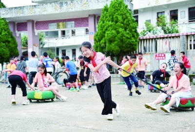 5月25日,福建省泉州市永春县蓬壶镇仙岭小学的学生利用废旧轮胎胶圈在课间做游戏。 福建省泉州市永春县蓬壶镇仙岭小学位于山区,学生都来自农家。从2018年起,该校老师尝试将废旧轮胎胶圈与课间体育活动相结合,编制胶圈课间操,还开发了二三十种胶圈游戏。如今,该校已形成了废旧胶圈特色大课间模式,用“土办法”变废为宝,增强了孩子们的体质,为孩子们带来快乐。 新华社发(康庆平/摄)