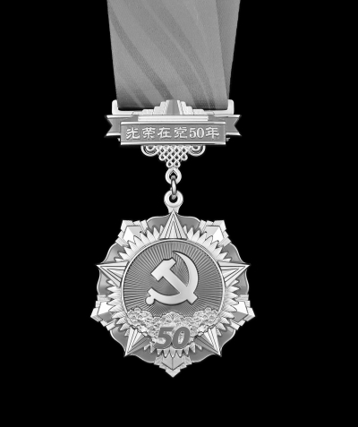 “光荣在党50年”纪念章通径为50毫米,材质为铜和锌合金,主色调为红色和金色。主章由党徽、五角星、旗帜、丰碑、向日葵、光荣花、光芒等元素构成,其中党徽象征党的领导核心地位和党员信念坚定、对党忠诚;丰碑寓意党的光辉历程和丰功伟绩;向日葵寓意全党全国各族人民紧密团结在党中央周围;光芒象征党的光辉照耀;五角星代表薪火相传;光荣花寓意繁荣盛世、国泰民安和褒奖荣耀;旗帜象征共产主义崇高理想与事业永续。副章由山河、中国结和红飘带等元素组成,飘带上雕有“光荣在党50年”字样,寓意党员不忘初心、牢记使命,勇攀高峰、永葆青春。