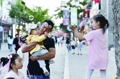 6月1日,家长带着孩子在滦州古城游玩。 河北省滦州市坐落于滦河沿岸,1976年唐山大地震后,滦州市进行了城区整体转移,形成了新老城区并行的格局。因种种历史遗存问题,老城在经济发展的轨道上与新城渐行渐远,一度成为城市发展的“堵点”。 为解决老城改造问题,同时探求产业发展多元化之路,滦州市将文旅产业作为城市发展的新路径,在老城区建设滦州古城旅游景区,将当地历史悠久的皮影、评剧、剪纸等文化根植其中,同时融合旅游、建筑、商业、人居等要素。自2012年开城接待游客以来,滦州古城景区现已进驻商家700余家,旅游业持续火爆,被评为国家4A级旅游景区。曾经衰落的滦州老城区如今焕发新生,成为远近闻名的“网红打卡地”。