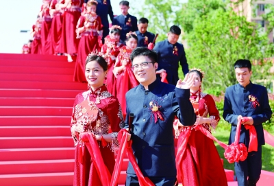 6月6日,新人们携手步入集体婚礼现场。 当日,中铁四局在安徽合肥为百对新人举办集体婚礼。据悉,参加集体婚礼的职工大多是中铁四局各建设单位一线的年轻骨干,他们常年奔波在生产一线,有的婚期一拖再拖。隆重而简朴的集体婚礼,既倡导了婚事新办,又让新人们感受到集体的关怀。