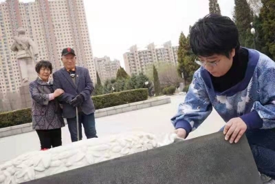 乔安山夫妇和孙女乔婷娇在雷锋墓前祭奠雷锋。