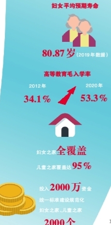 健康水平再上新台阶。人口素质和儿童健康水平大幅提高,健康领域核心指标均提前达到纲要(规划)目标。妇女常见病、多发病得到有效防治,妇女平均预期寿命延长至80.87岁(2019年数据),孕产妇死亡率降低至9.52/10万,新生儿死亡率、婴儿死亡率和5岁以下儿童死亡率等核心指标分别下降至1.69‰、2.92‰和4.69‰,孕产妇产前检查率达98.29%。