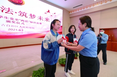 现场活动分为4个环节,“邀你懂我”“为你检答”“数你最牛”“请你代言”。“未成年人保护法涉及未成年人的哪些权益?”“检察机关是做什么的?未成年人检察又主要做哪些工作?”自治区检察院检委会专职委员马迎春和未检检察官结合检察实务,为同学们解开心中的困惑。