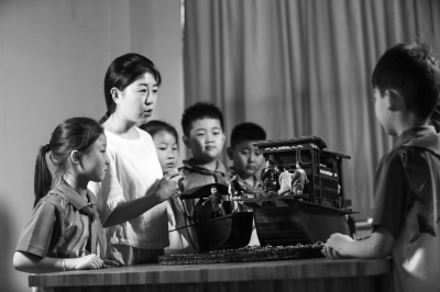 2021年6月7日,在河北省邢台市平乡县妇女创业之家,软陶泥艺术爱好者夏媛媛在向参观学生讲解红船精神。 夏媛媛是河北省邢台市平乡县一名软陶泥爱好者,她历时3个月创作完成的软陶泥作品《红船精神代代传》,艺术表现了1921年7月21日至30日党的一大在上海召开受阻后,转移到浙江嘉兴南湖红船的情景,为建党百年献上真挚祝福。中国妇女报全媒体记者周丽婷/柴更利 摄影报道