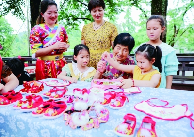 6月13日,在浙江省湖州市长兴县小浦镇方一村,当地的非遗传承人教孩子们制作老虎鞋、老虎帽。连日来,各地举行丰富多彩的民俗文化活动,欢庆端午佳节。新华社记者 徐昱/摄