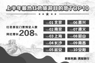 根据在携程平台的浏览数据,报告还发布了上半年极具人气的红色旅游目的地TOP10,分别是北京、南京、上海、长沙、延安、嘉兴、遵义、韶山、南昌、安阳。
