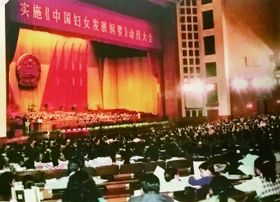 ▲ 1995年,中华人民共和国国务院颁布第一部《中国妇女发展纲要(1995-2000年)》。图为1996年5月召开的实施《中国妇女发展纲要》动员大会。