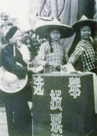 ◀ 1953年12月,在全国范围内进行的基层选举是中国有史以来第一次大规模的普选运动,84%以上的妇女参加了选举投票。图为妇女参加选举投票。