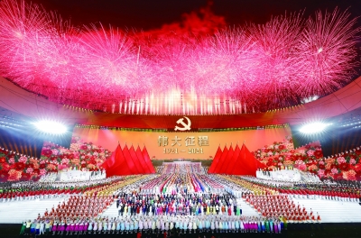 6月28日晚,庆祝中国共产党成立100周年文艺演出《伟大征程》在流光溢彩、气氛热烈的国家体育场举行。